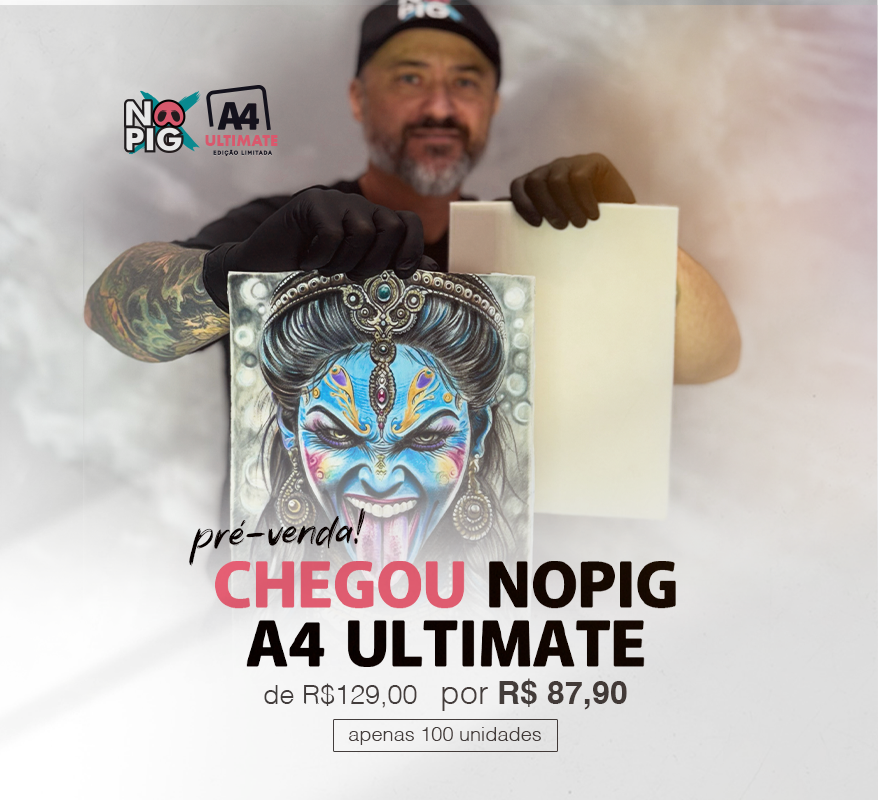 "Eu sou tatuar iniciante, e com relação a peles caseiras e de outras marcas, a NOPIG é muito superior, porque a textura da pele NOPIG é muito semelhante com a pele humana. Fora isso, tem o decalque, porque o decalque fixa bem, diferentemente das outras peles. Outro fator muito importante é a coloração, se você passar tinta preta, colorida, clara, tinta branca, fica. Ela não sai. Independentemente do tempo que for ela vai ficar. Não mosquem, vão de NOPIG!"